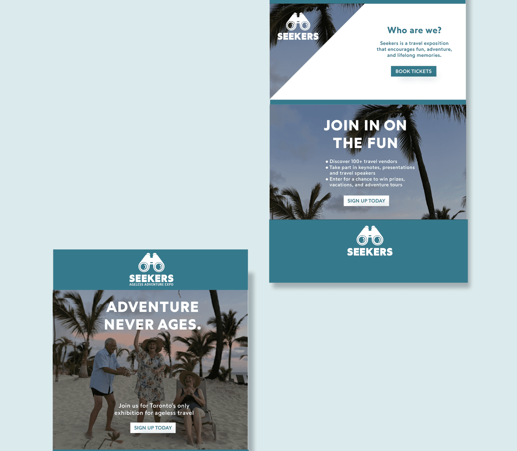 For Seekers, the design spans web, motion, and iconography to create a cohesive and modern visual experience. Original travel photography adds authenticity and a sense of adventure while legibility and clean layouts ensure clarity. The design contrasts with traditional branding for this demographic by embracing a modern, fun, and adventurous tone. Every element from motion interactions to icons and typography feels approachable, inspiring, and judgement free, reflecting the spirit of exploration at any age.