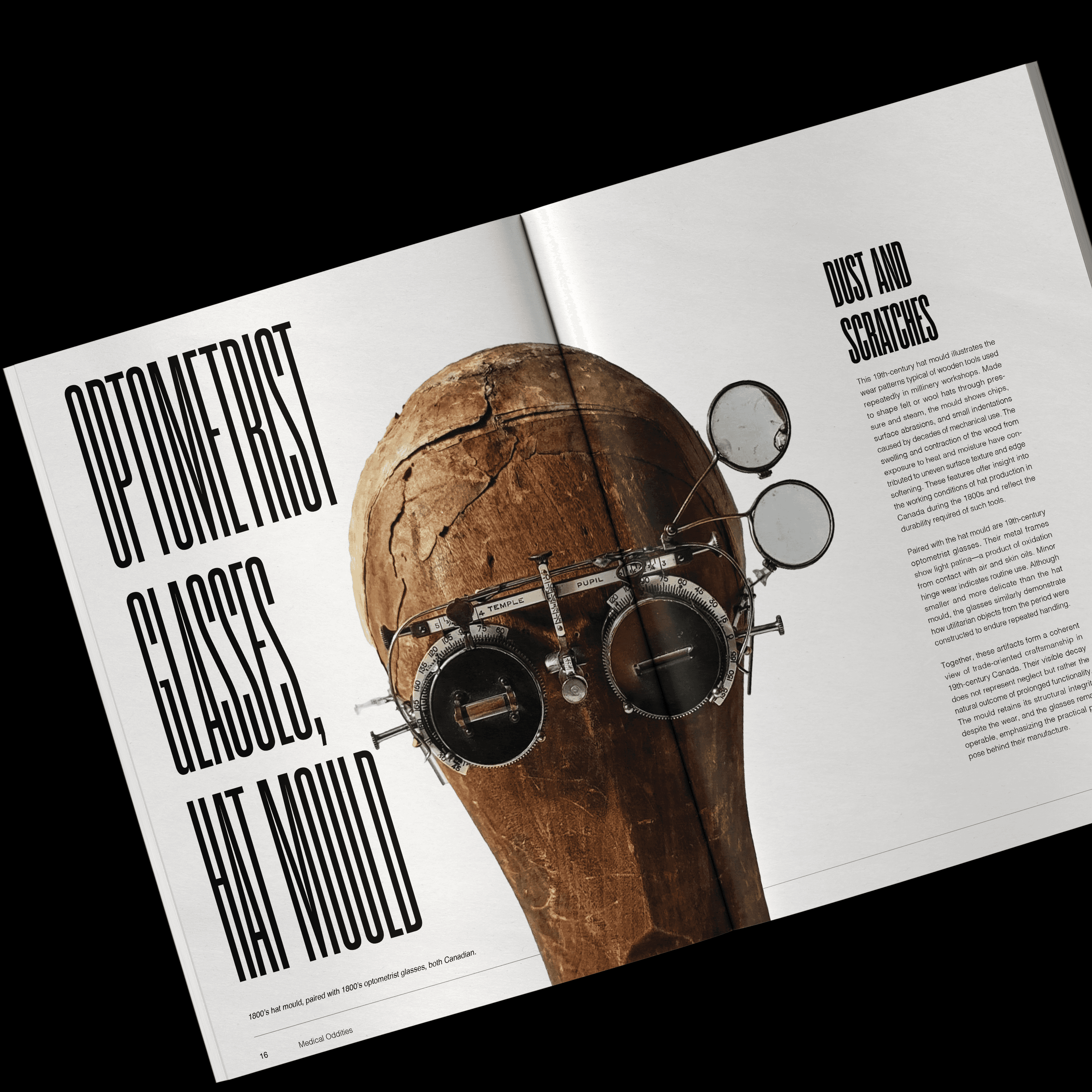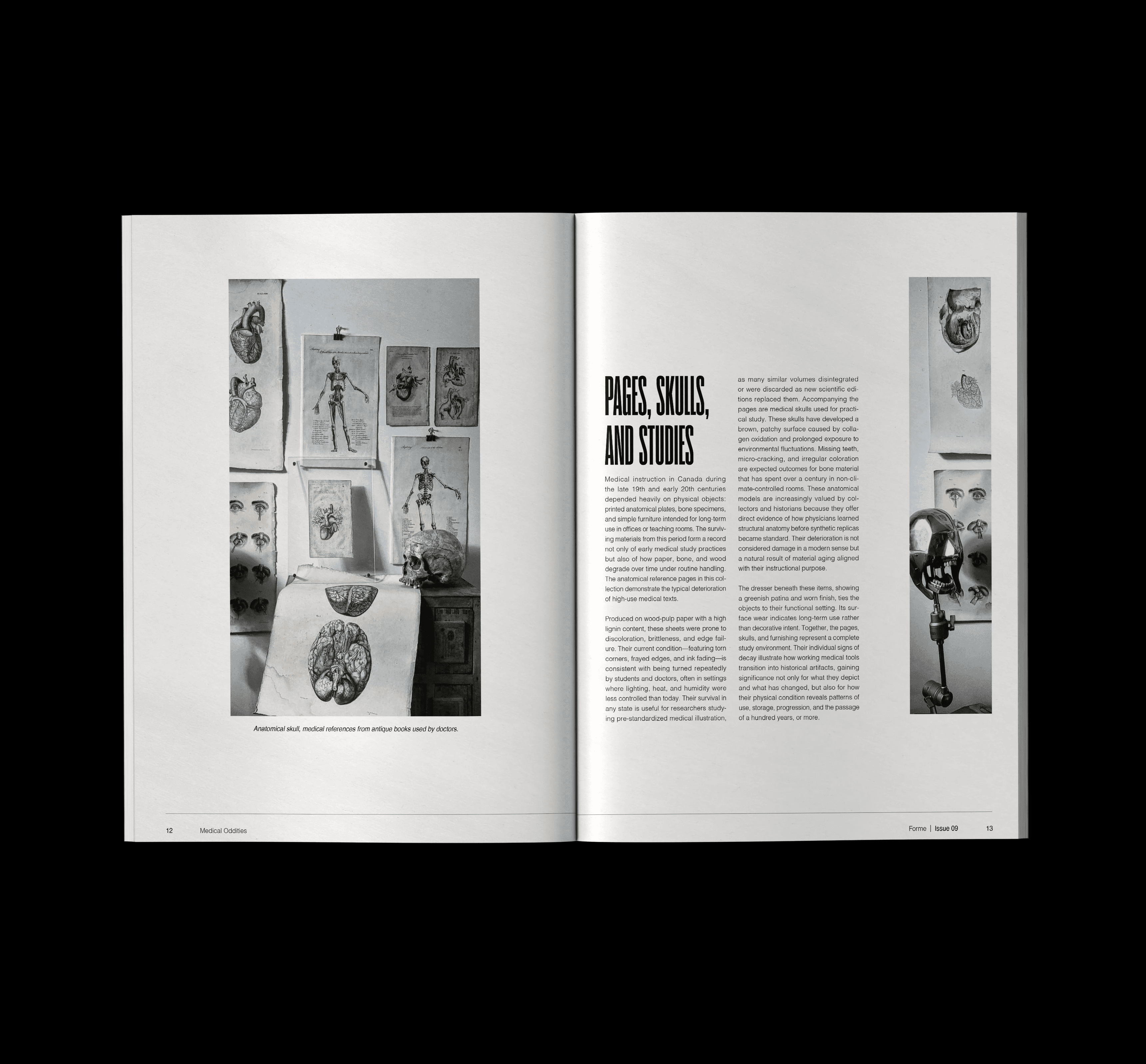 The magazine combines bold typography, dramatic photography, and intentionally offbeat layouts to balance clarity with visual intrigue. Some spreads feature singular, cut-out images paired with playful type, while others use unique layouts to maintain reader engagement and deliver information in a clean, approachable way. Each design choice reinforces FORME’s mission to be educational, visually compelling, and fun, transforming every feature into a striking exploration of history and aesthetics.