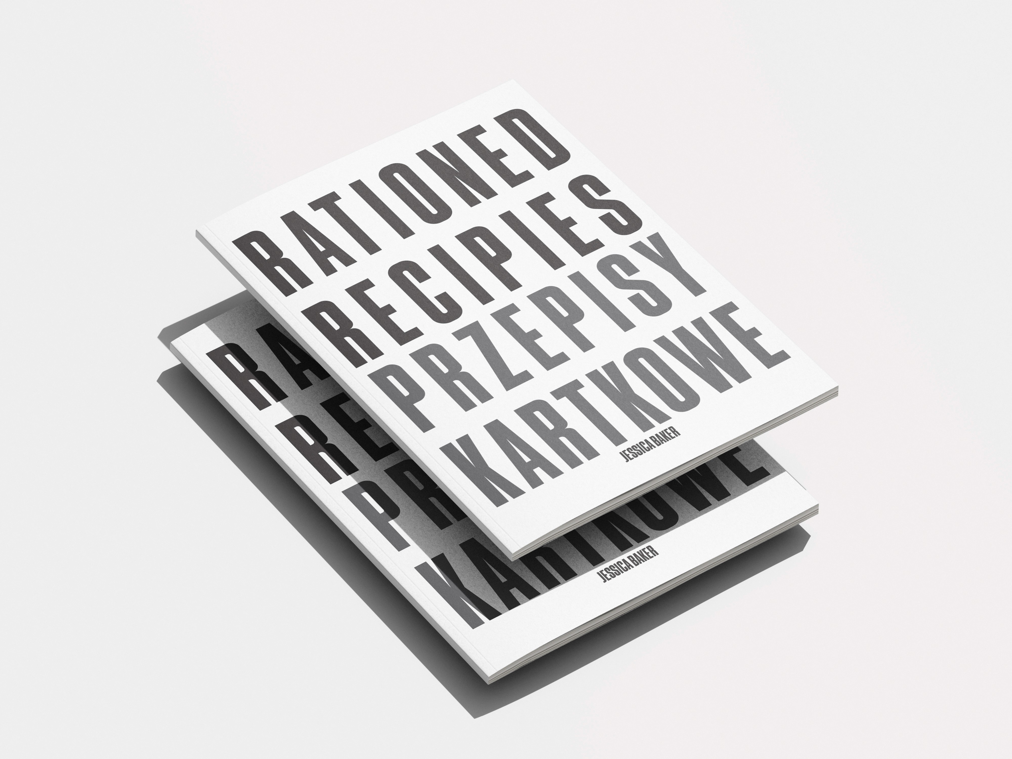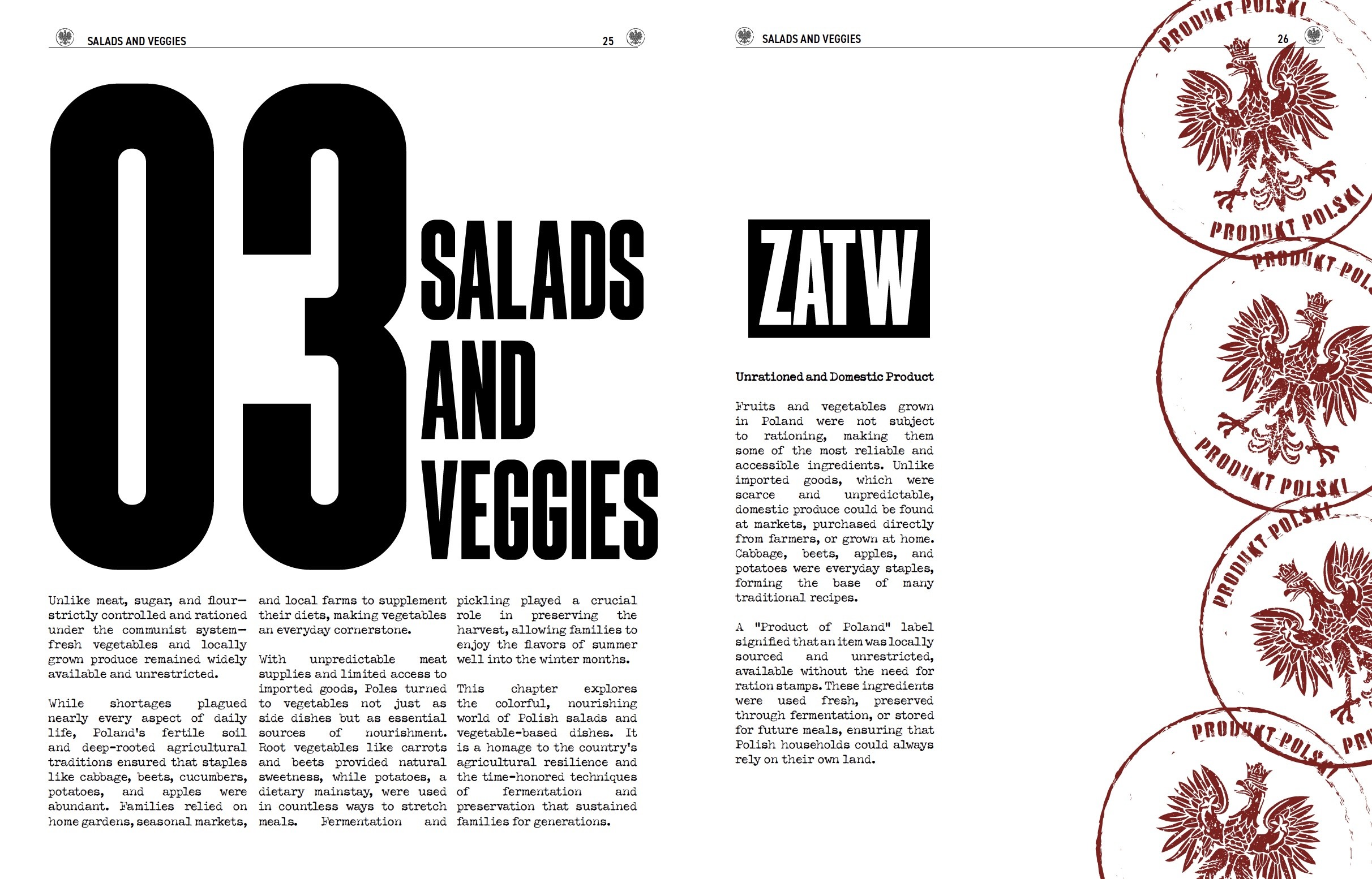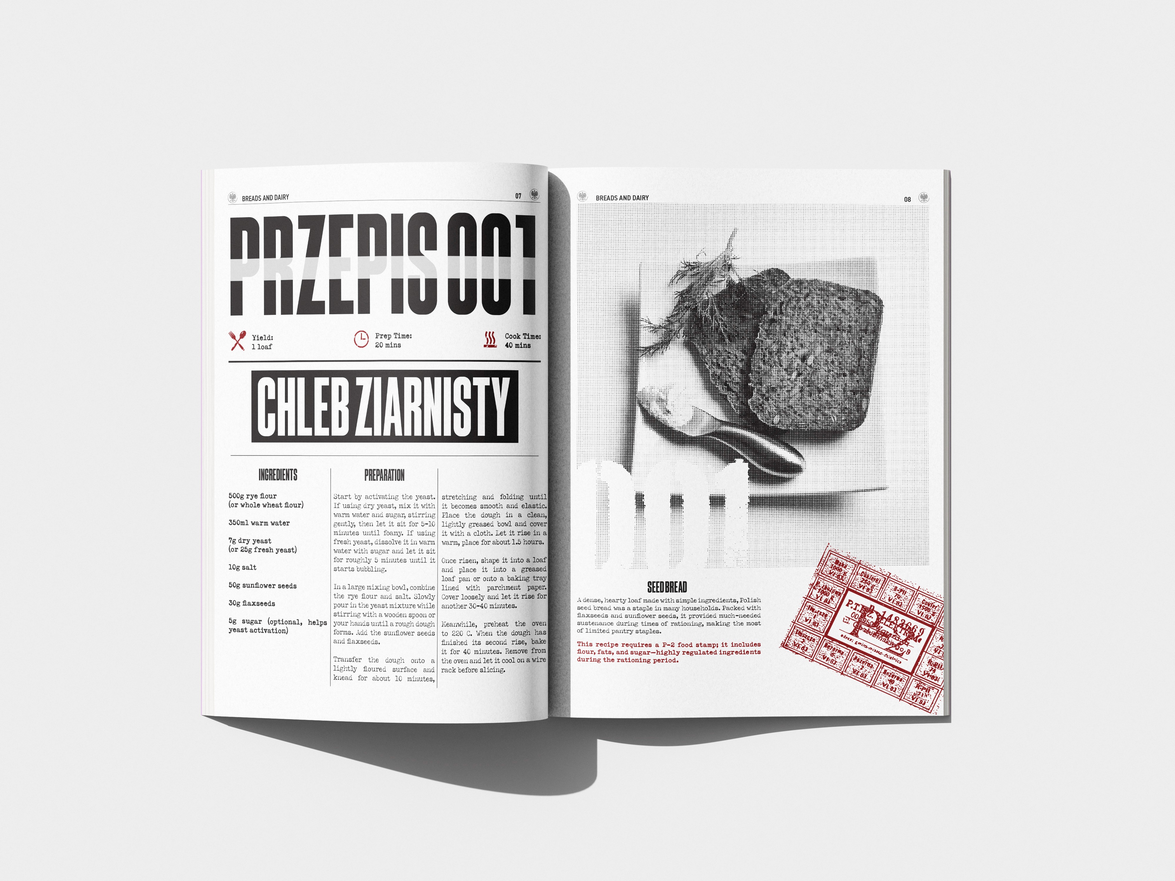 The design balances brutalist layouts with precise typography and a monochrome palette, punctuated by selective pops of colour in stamps and numbers. The physical book features a translucent vellum cover, allowing Polish translations and underlying details to peek through, creating a layered, tactile experience. Each spread maintains historical accuracy while remaining visually clear, turning recipes and archival context into a cohesive, immersive experience that is both authentic and striking.