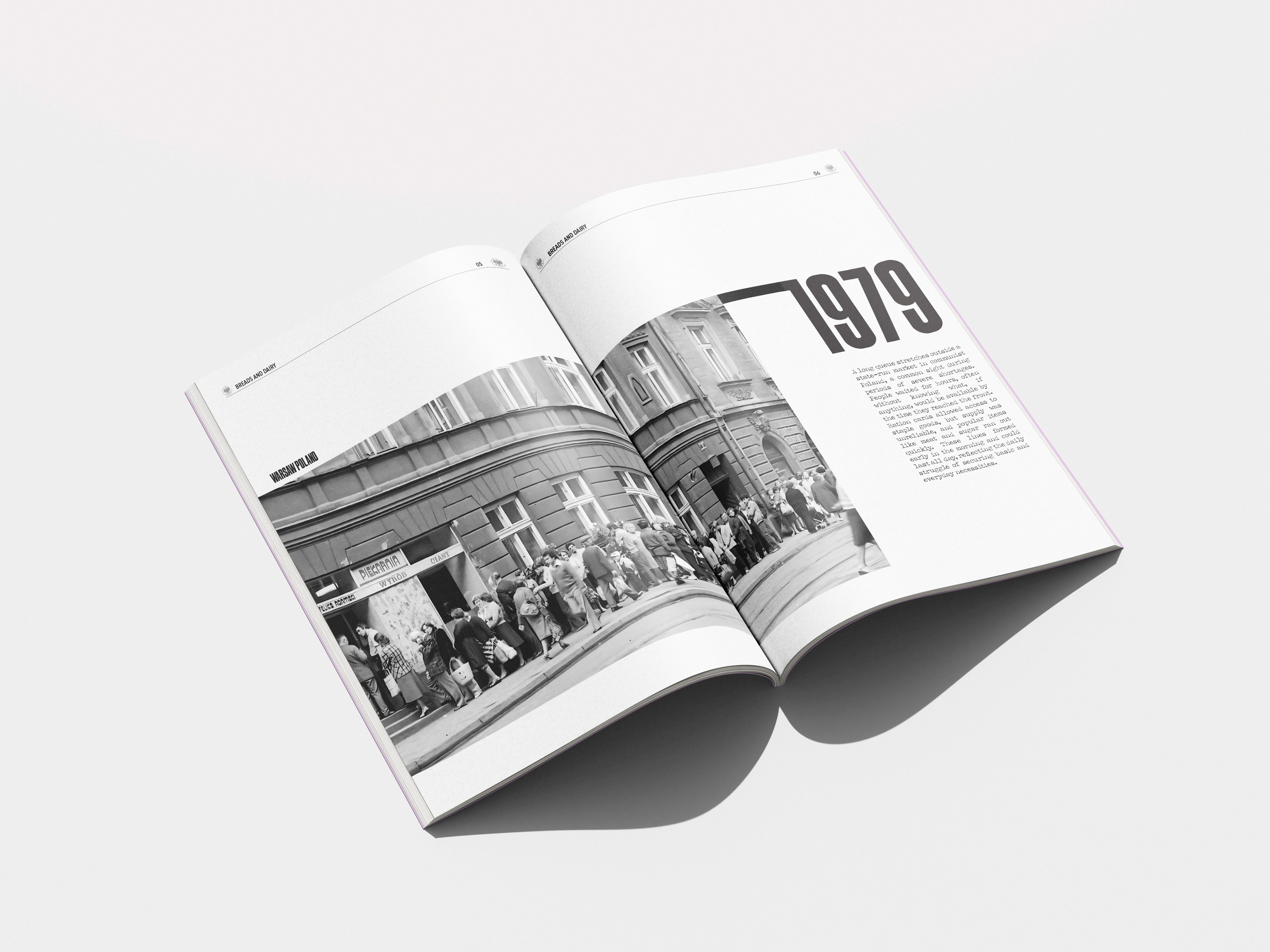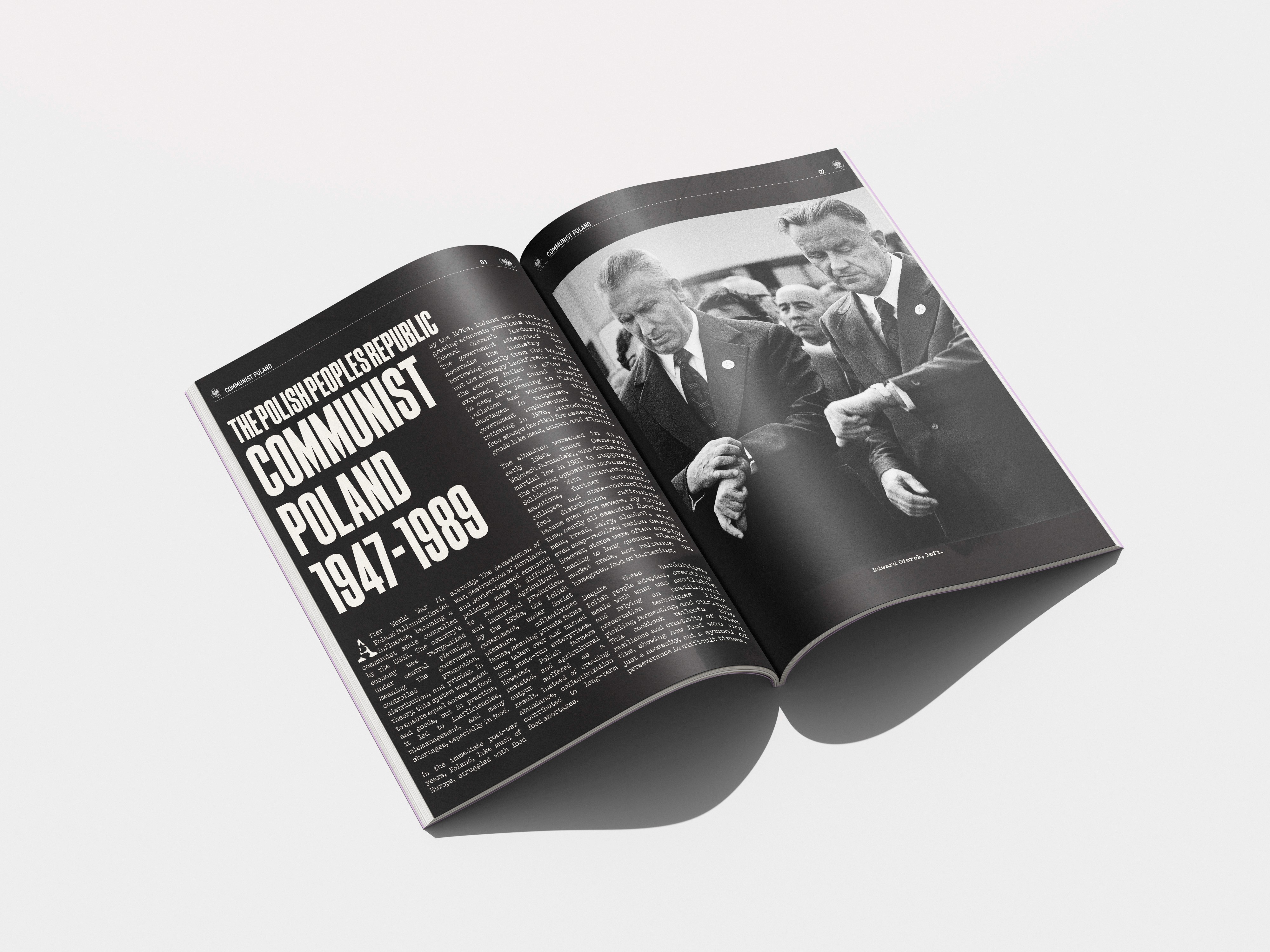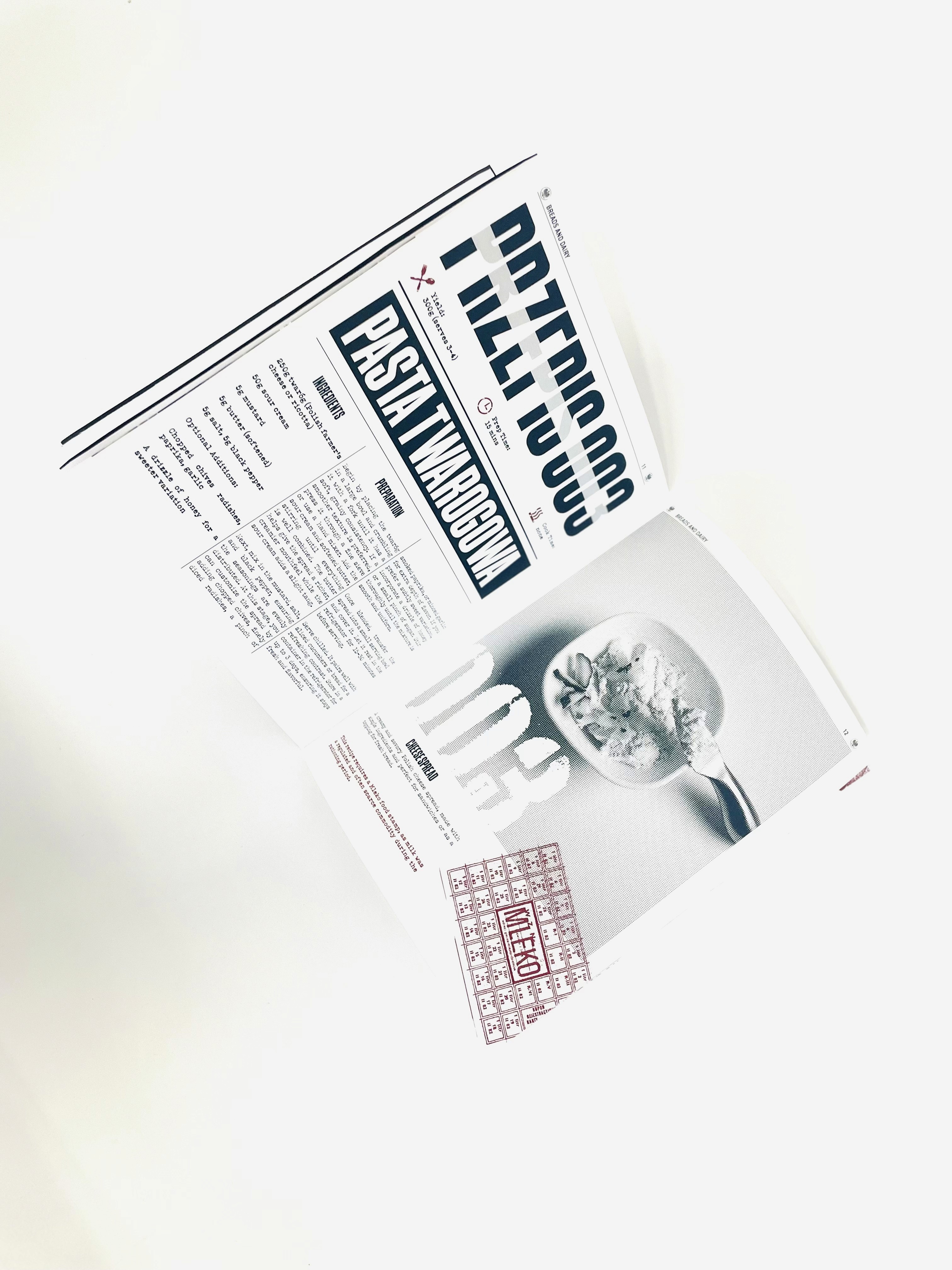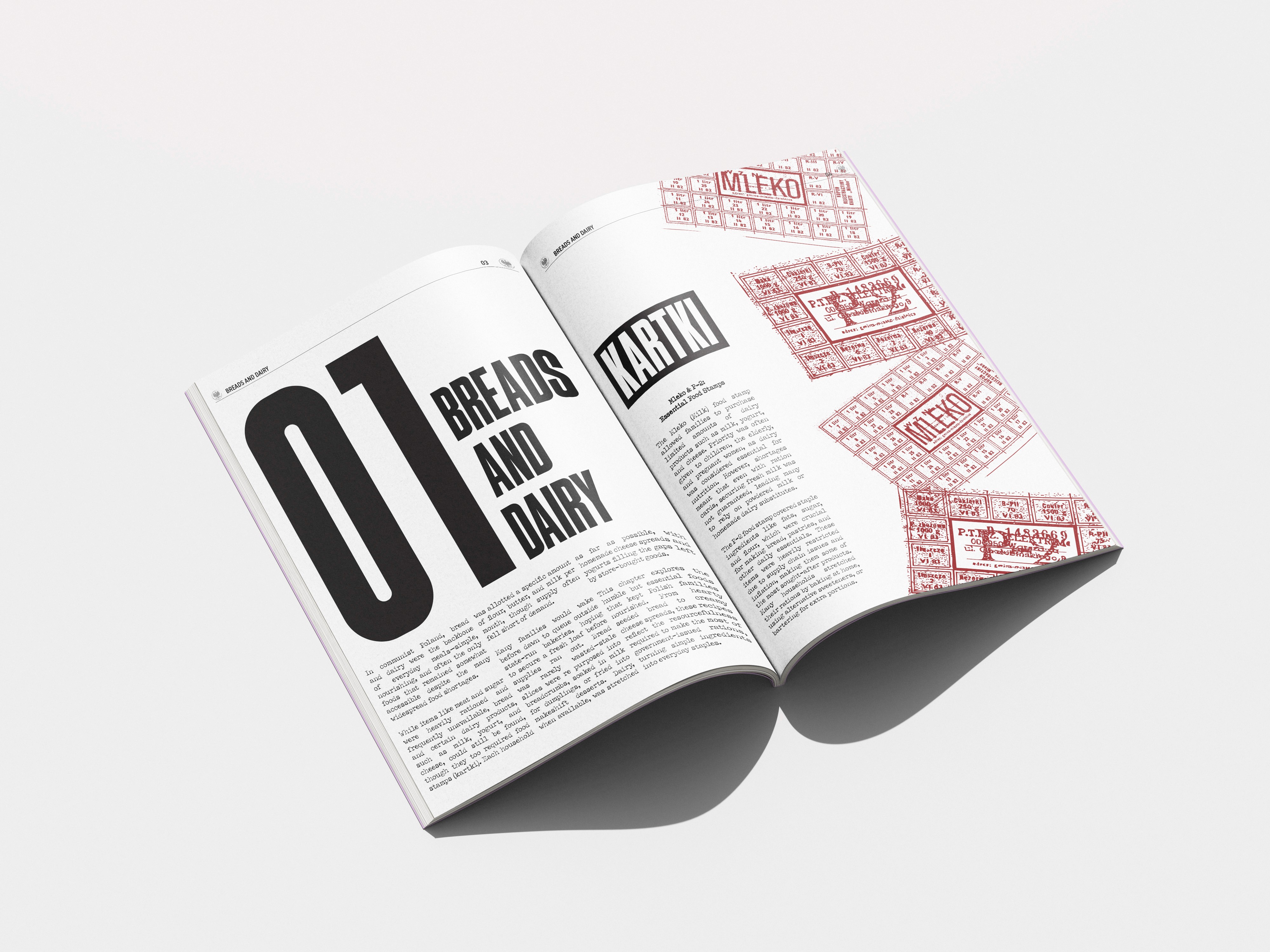 The design balances brutalist layouts with precise typography and a monochrome palette, punctuated by selective pops of colour in stamps and numbers. The physical book features a translucent vellum cover, allowing Polish translations and underlying details to peek through, creating a layered, tactile experience. Each spread maintains historical accuracy while remaining visually clear, turning recipes and archival context into a cohesive, immersive experience that is both authentic and striking.